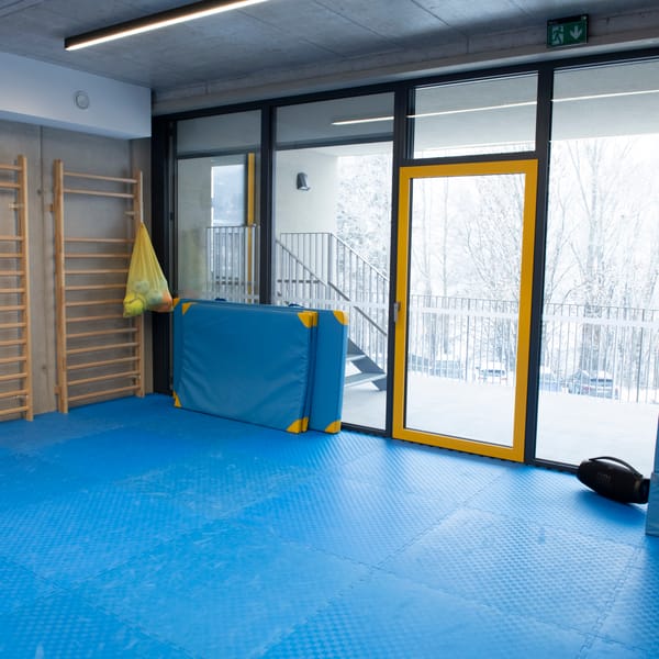Plne vybavená pohybová miestnosť s modrými matracmi pre každodenné cvičenie a rozvoj motoriky.